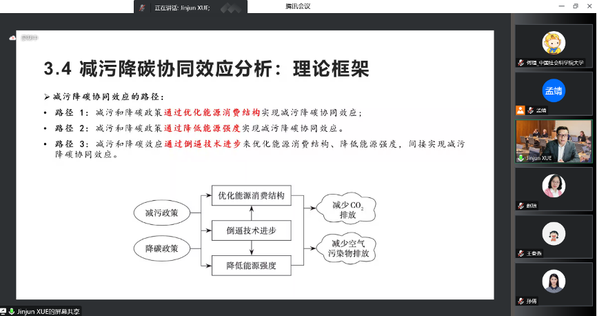 在讲座的第二部分,薛进军教授对减污降碳协同效应的实证分析部分进行了讲解。薛进军教授首先介绍了减污降碳协同效应分析的概念和原理。减污降碳协同效应一方面包括降碳政策的减污效应,另一方面包括减污政策的降碳效应。由于温室气体排放与大气污染物排放具有同根、同源、同过程的特点,减污降碳可以进行协同治理。薛进军教授带领的研究小组以2010年至2019年中国30个省份作为研究样本,分别对减污政策的降碳效应和降碳政策的减污效应进行了回归分析。回归结果表明,中国的减污政策和降碳政策均具有明显的协同效应,进一步从减污降碳协同增效的动态分析上看,以碳市场为主的降碳政策的减污协同效应显著优于减污政策的降碳协同效应。通过对减污降碳协同增效的路径检验发现,减污政策的协同性主要通过优化能源消费结构、降低碳排放强度、倒逼技术进步来实现,而降碳政策的协同性主要是通过前两条路径来实现。究其原因,中国降碳政策起步较晚,且主要以碳市场为主,因此对技术进步的倒逼作用还未完全体现。最后,薛进军教授基于实证结果,对中国减污降碳协同增效提出若干政策建议。