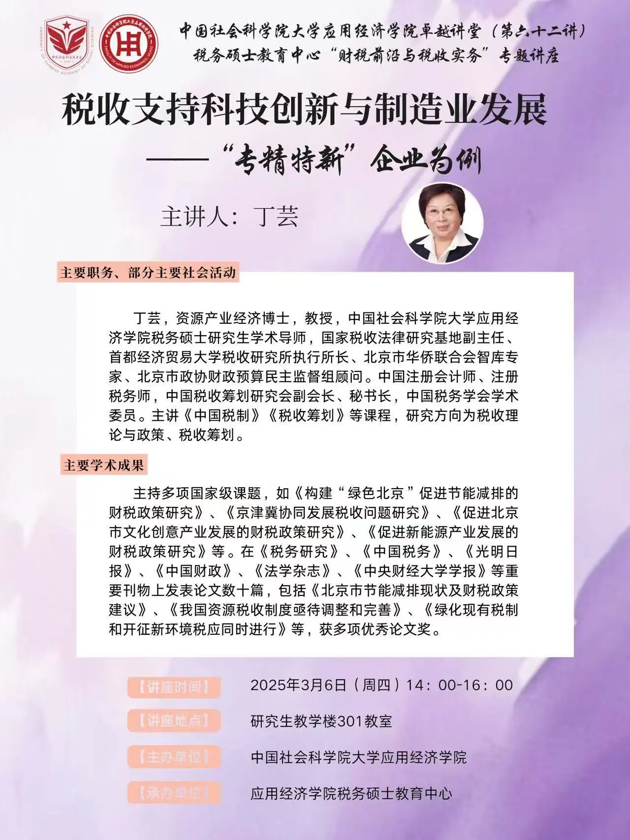 卓越讲堂预告|丁芸:税收支持科技创新与制造业发展——“专精特新”企业为例
