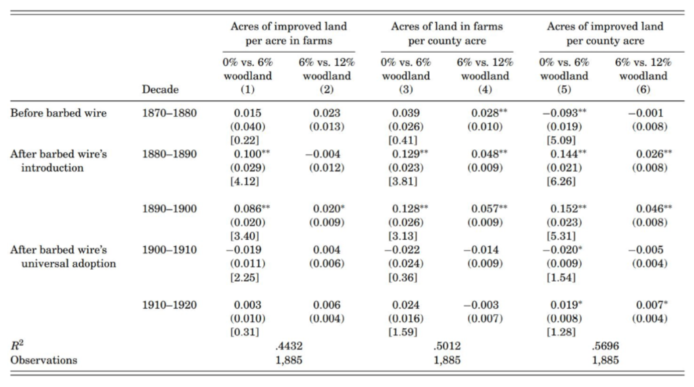 为讲解连续型DID,尤老师介绍了Richard Hornbeck (2010)的论文。在铁丝网出现前,养牛人和种庄稼的农民间存在产权界定和保护的问题,铁丝网的出现降低了耕地保护的成本。而1880年至1900年刺铁丝网的引入和普及,根据林地覆盖率的不同,对不同地区产生了不同的影响。森林覆盖率高的地区更容易制取木栅栏,因而受铁丝网影响小。在这个案例中,不同地区受政策的影响不同,发生的变化也是连续的。研究发现,森林覆盖率低的地区,耕地的状况得到了改善。