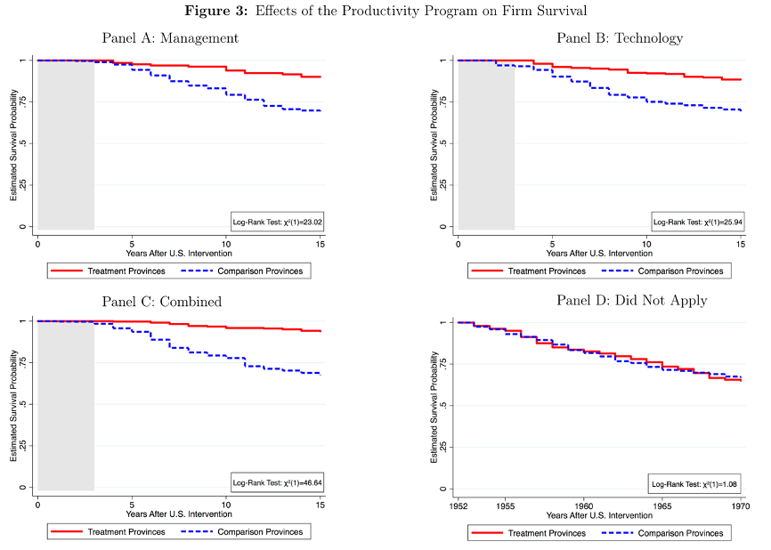 因果识别是进行DID的重要目的,处理组和控制组的结果变量需具有相同的潜在趋势则是识别的重要假设,因此使用DID前应当进行平行趋势检验和安慰剂检验。平行趋势检验的要点在于,应当选择尽可能多的前置时期,选择的时间段过短可能影响模型的可信度。安慰剂检验,又称假设在某个时间点发生了某事件或政策变化,而实际上并没有发生,然后对DID模型进行估计,检验系数是否显著。进行安慰剂试验至少需要政策前两期的数据。为讲解“理想的”平行趋势检验的例子,尤老师以Michela Giorcelli(2019)的论文(The Long-Term Effects of Management and Technology Transfers)为例。该文章的背景是1952至1958年马歇尔计划美国战后对意大利开展援助,处理组的中小制造企业企业可以申请该项目,并可以决定是否派遣他们的经理到美国(管理转移),购买美国的机器(技术转让),或者同时做(管理和技术转让相结合),以5到15年为区间,可以看出接受了管理培训和技术转移的企业具有更高的存活率。“生产力计划”选择的处理组省分和试点地区具有随机性,假设没有该计划,当年进行申请的处理组省份和控制组省份将会有相同的趋势。