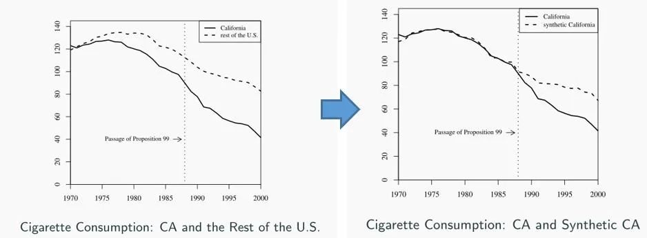 通过加州关于香烟消费的99号提案(Abadie et al.,2010)的例子能够更好地理解合成控制法的基本原理。1988年,加州首次通过了全面的烟草控制立法(香烟税、媒体宣传禁烟等)。要探究这样的政策是不是对加州的烟草消费有因果性影响,可以利用合成控制法将38个从未通过此类政策的州作为控制地区,拟合出一条和加州在事前趋势相同的曲线(synthetic California)。