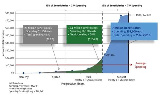 此外,认知症应尽早干预,才能使得个人和社会的成本收益最优。图10显示15%的老人花费了75%的花费。若在疾病平缓期发现并尽早干预,可以节省大笔花费。