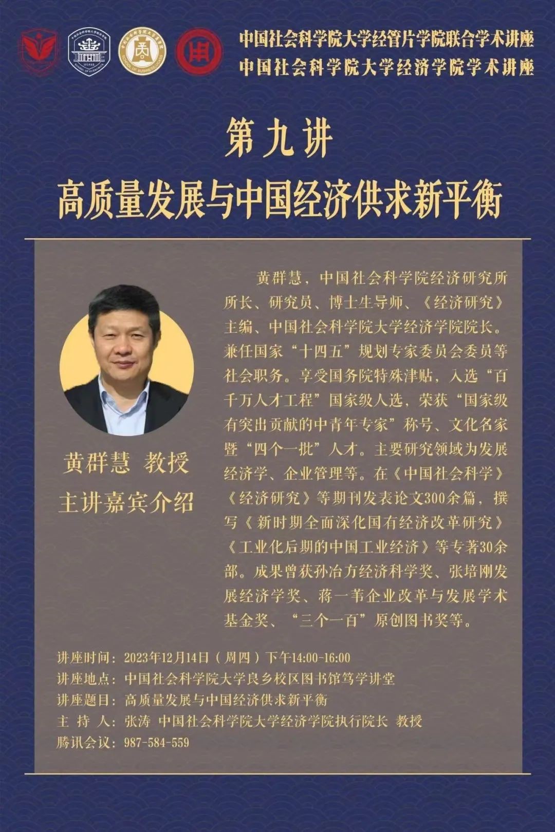 讲座预告|中国P站 经管片学院联合学术讲座 黄群慧:高质量发展与中国经济供求新平衡