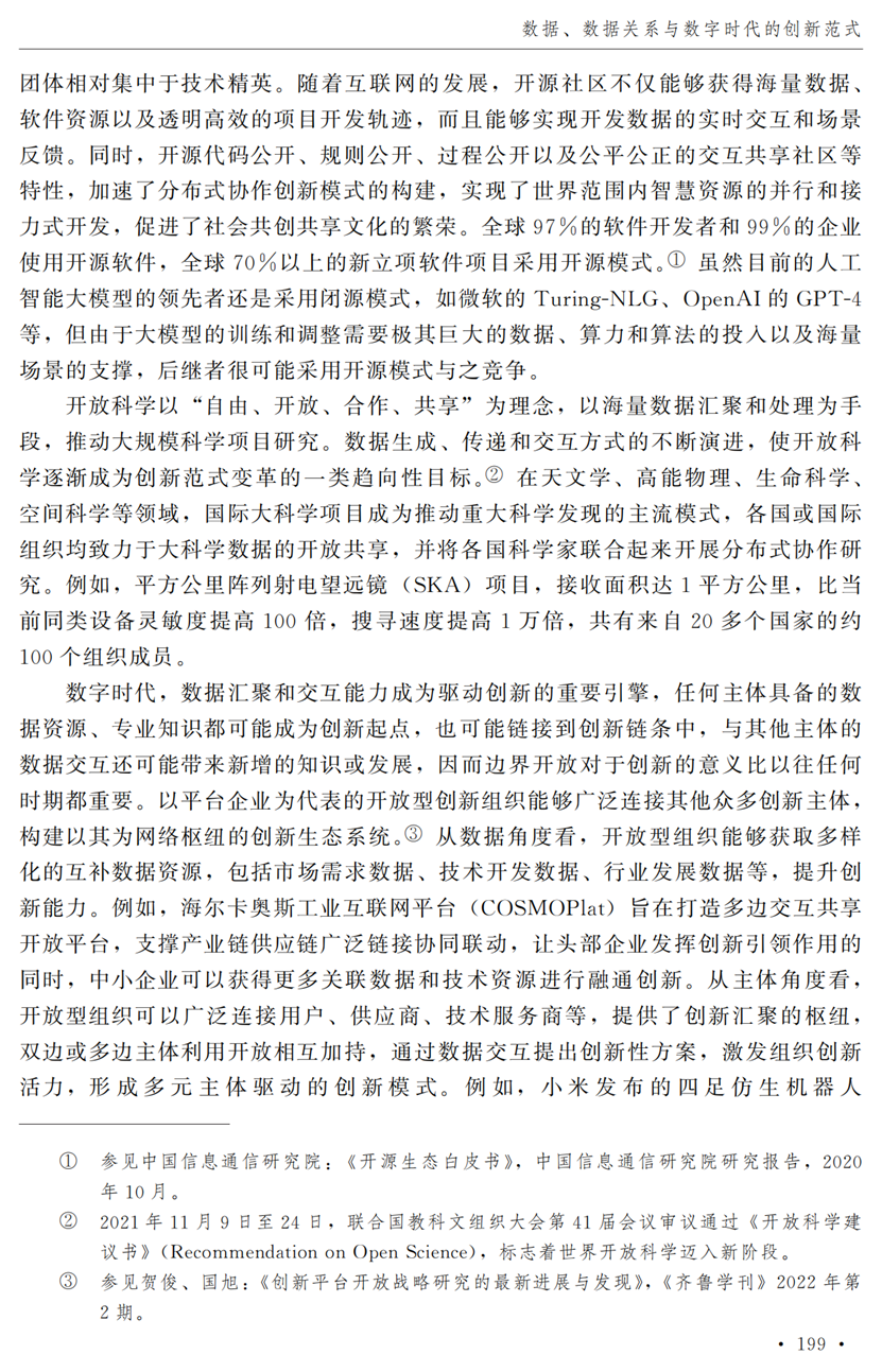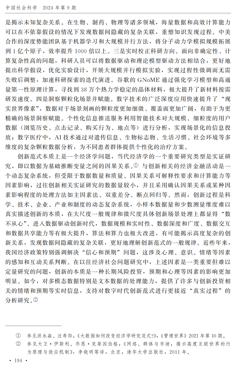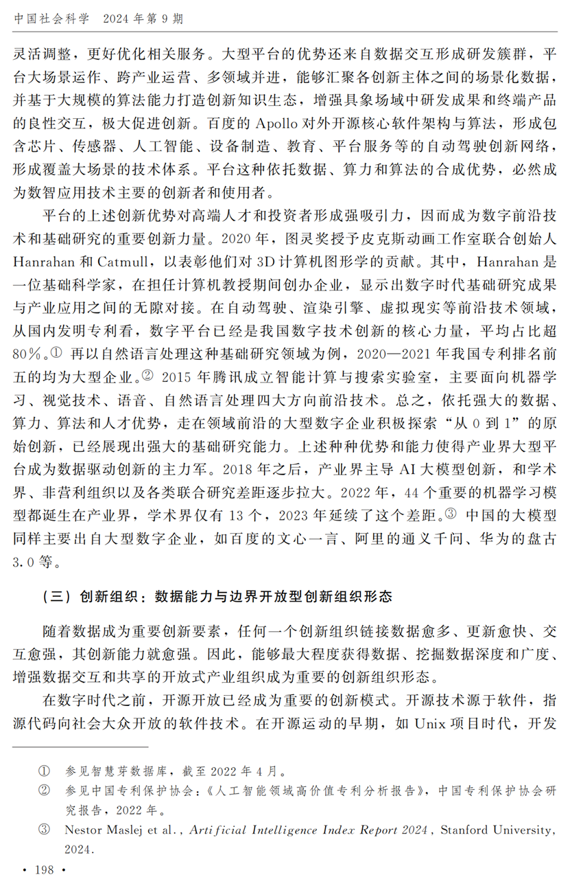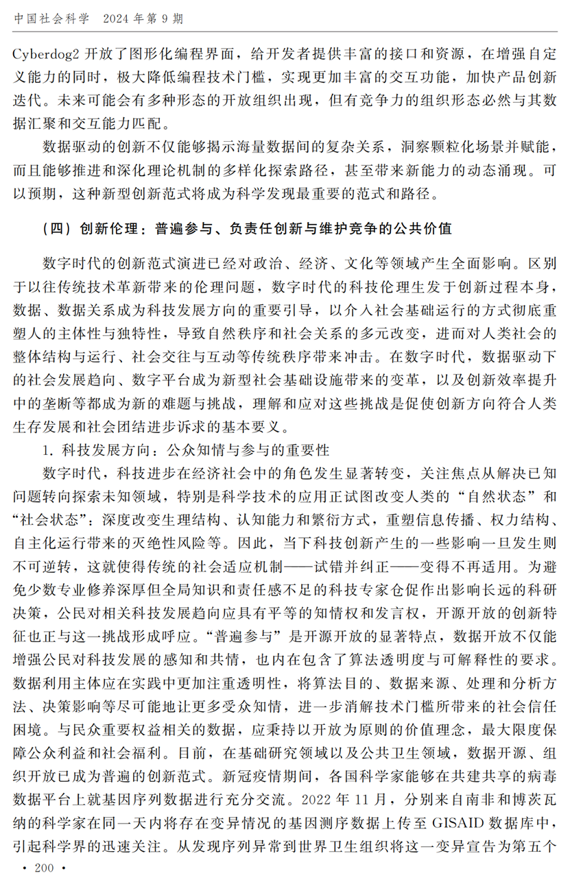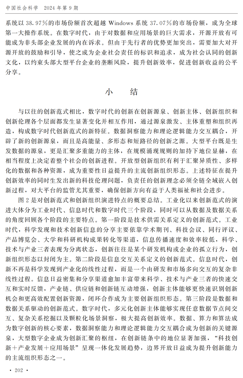 教授江小涓,中国社会科学院财经战略研究院博士后宫建霞,清华大学马克思主义学院助理研究员李秋甫,合作于《中国社会科学》2024年第9期发表论文《数据、数据关系与数字时代的创新范式》。文章指出,在数据和数据关系驱动的创新范式中,数据洞察能力和理论逻辑能力交互耦合成为创新的关键源泉,规模涌现效应使得大型平台在创新链条中的地位显著前移并全面提升,开源开放式创新则是提升数据汇聚交互能力和优化创新资源配置的重要组织形态。数据和数据关系的重要性生发出新的科技伦理问题,进而对人类社会的传统秩序带来挑战。深刻理解和把握新的创新范式,对于深化创新理论研究、构建国家创新体系以及强化创新政策导向等意义重大。