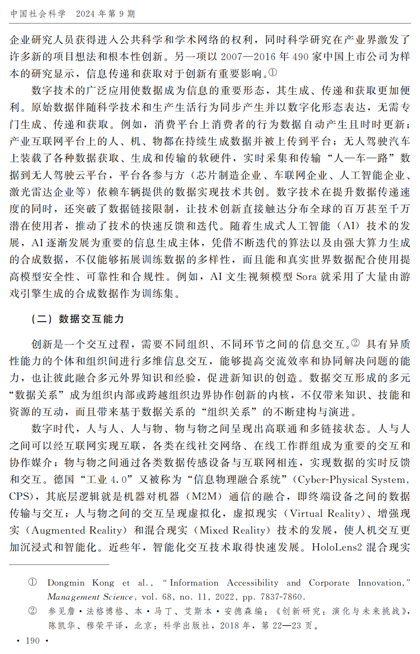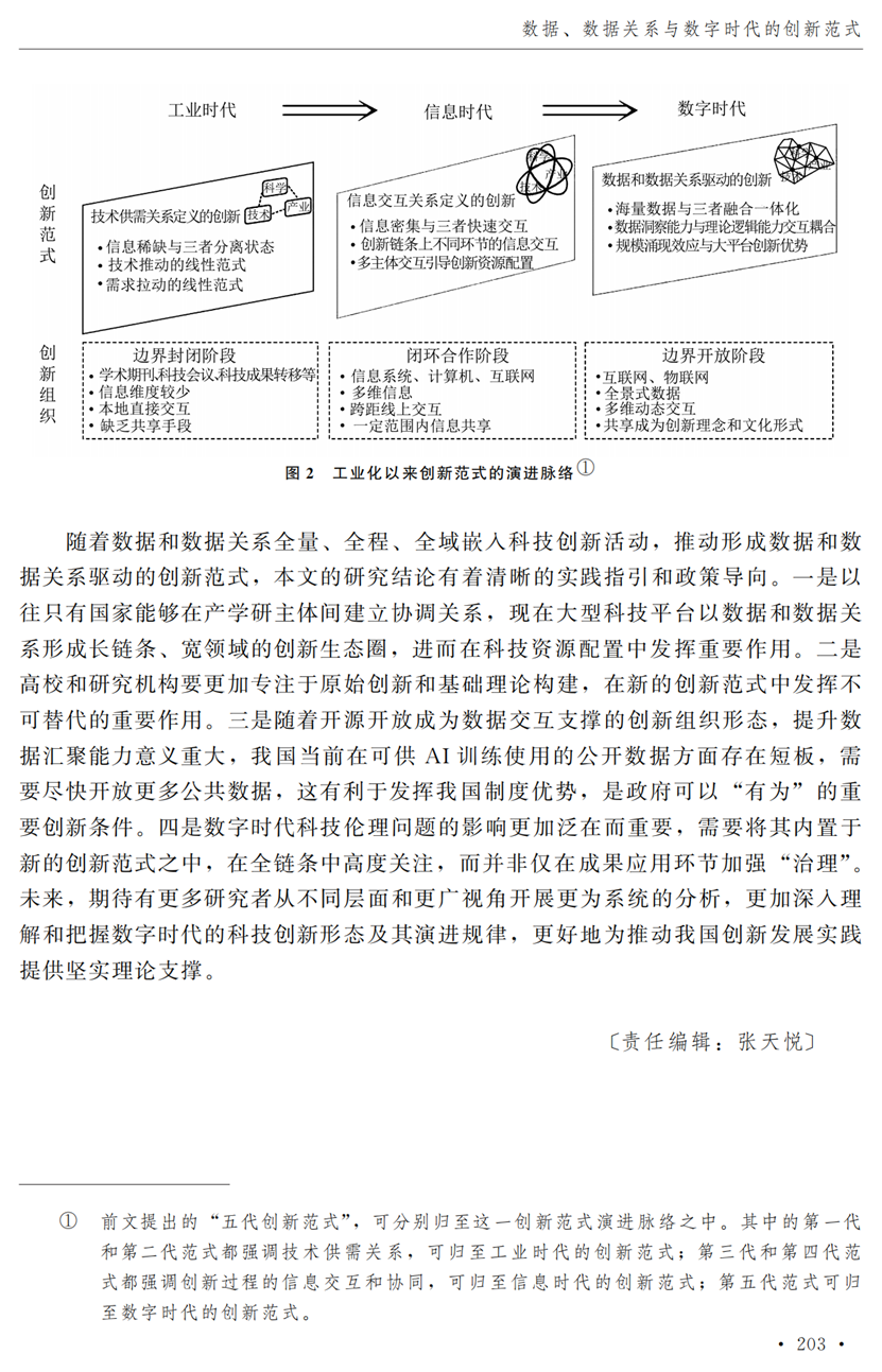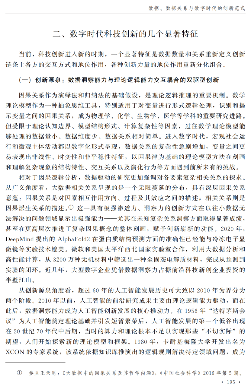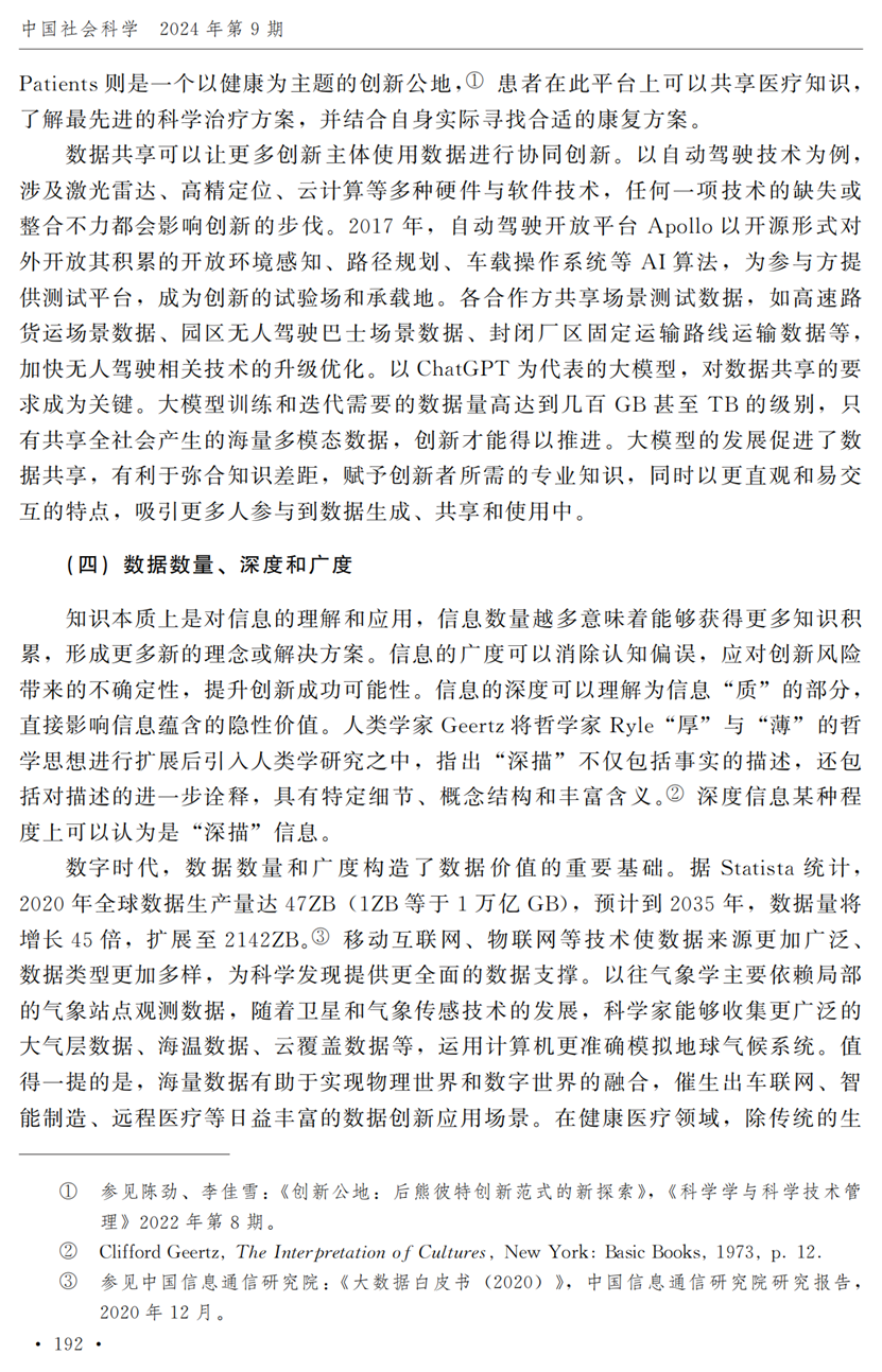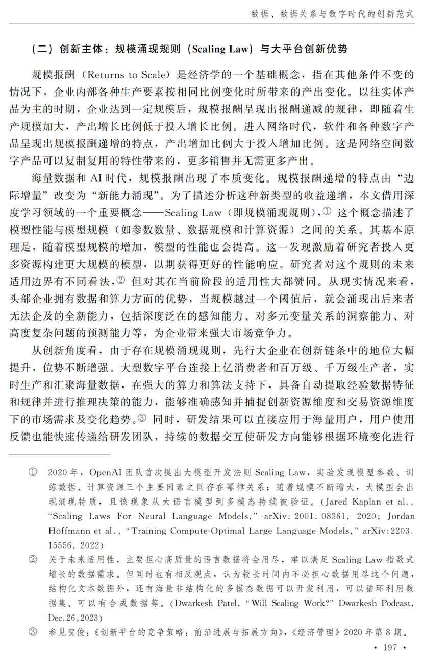 教授江小涓,中国社会科学院财经战略研究院博士后宫建霞,清华大学马克思主义学院助理研究员李秋甫,合作于《中国社会科学》2024年第9期发表论文《数据、数据关系与数字时代的创新范式》。文章指出,在数据和数据关系驱动的创新范式中,数据洞察能力和理论逻辑能力交互耦合成为创新的关键源泉,规模涌现效应使得大型平台在创新链条中的地位显著前移并全面提升,开源开放式创新则是提升数据汇聚交互能力和优化创新资源配置的重要组织形态。数据和数据关系的重要性生发出新的科技伦理问题,进而对人类社会的传统秩序带来挑战。深刻理解和把握新的创新范式,对于深化创新理论研究、构建国家创新体系以及强化创新政策导向等意义重大。