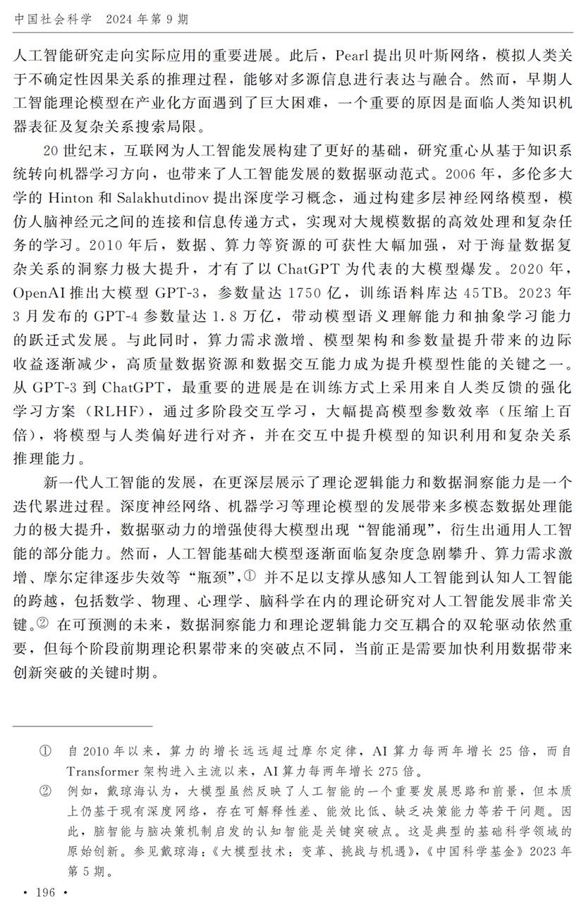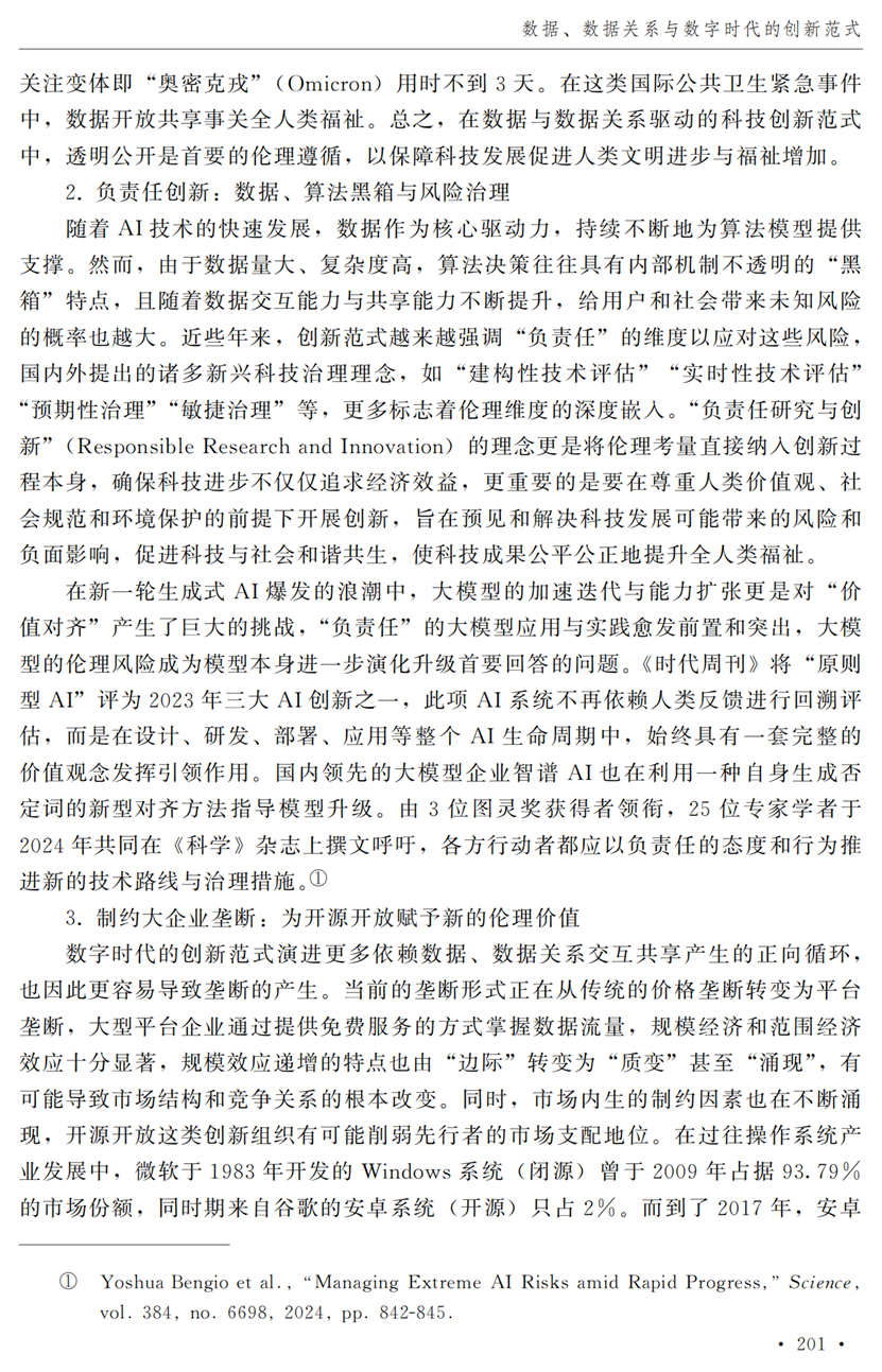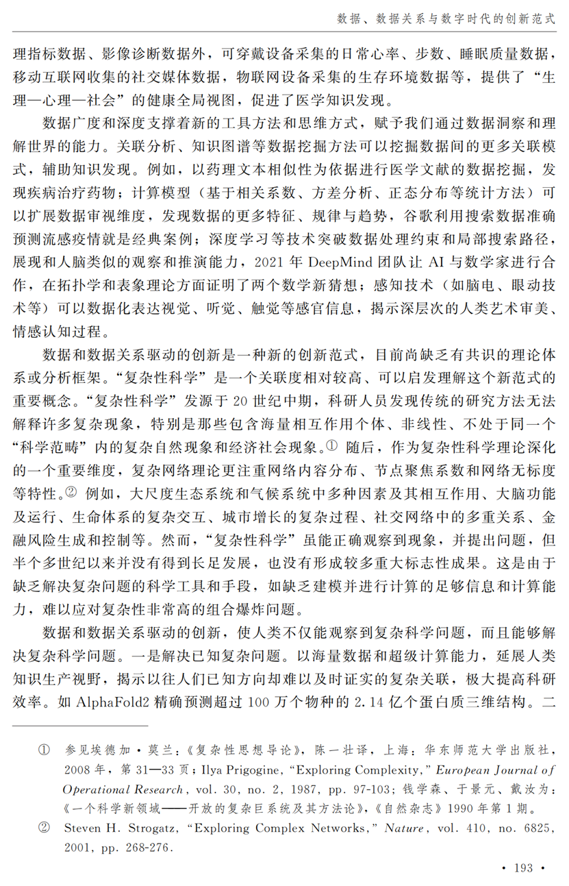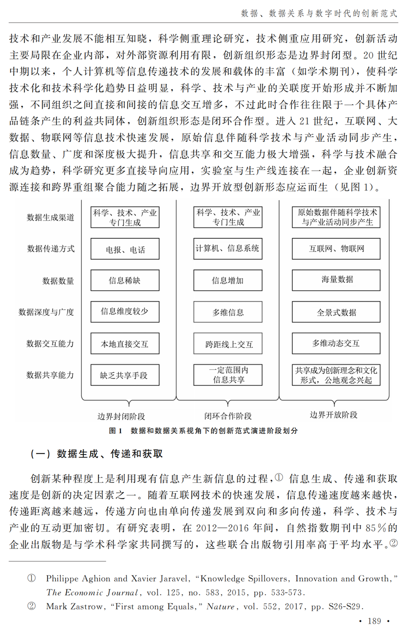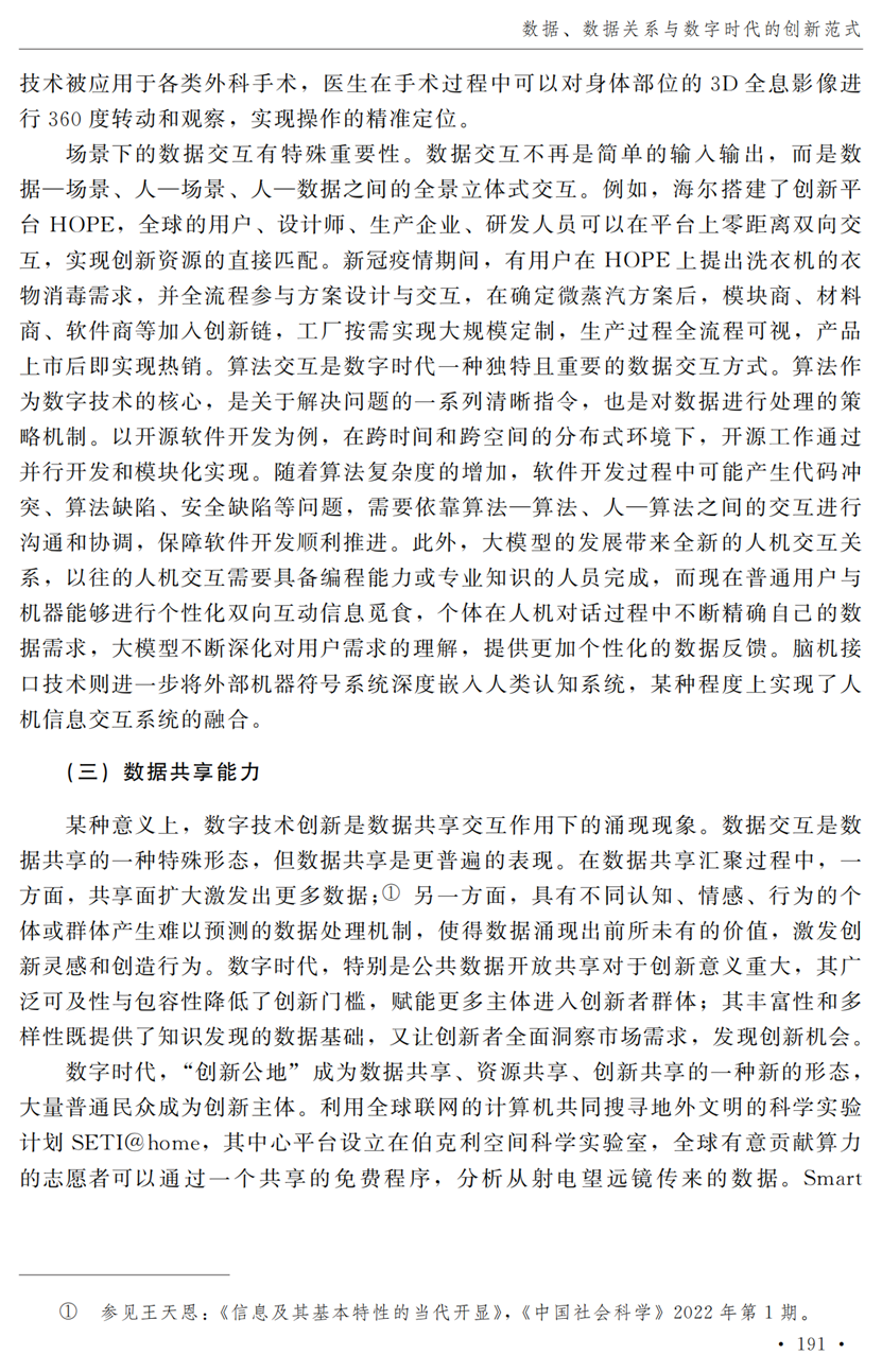 教授江小涓,中国社会科学院财经战略研究院博士后宫建霞,清华大学马克思主义学院助理研究员李秋甫,合作于《中国社会科学》2024年第9期发表论文《数据、数据关系与数字时代的创新范式》。文章指出,在数据和数据关系驱动的创新范式中,数据洞察能力和理论逻辑能力交互耦合成为创新的关键源泉,规模涌现效应使得大型平台在创新链条中的地位显著前移并全面提升,开源开放式创新则是提升数据汇聚交互能力和优化创新资源配置的重要组织形态。数据和数据关系的重要性生发出新的科技伦理问题,进而对人类社会的传统秩序带来挑战。深刻理解和把握新的创新范式,对于深化创新理论研究、构建国家创新体系以及强化创新政策导向等意义重大。