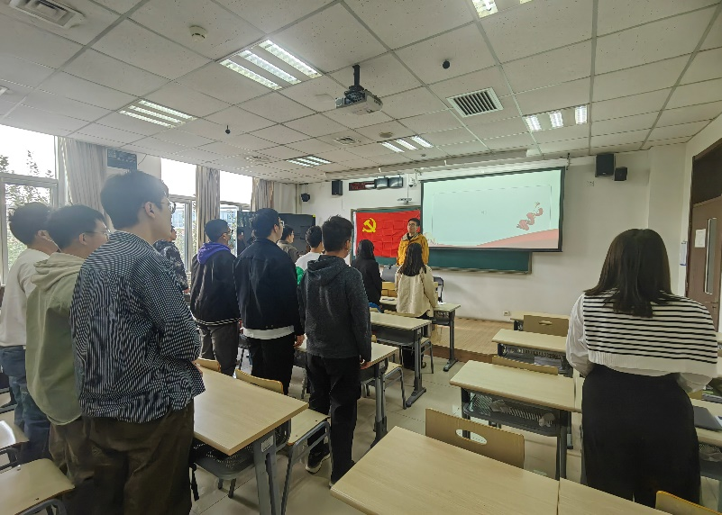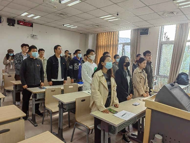 活动开始时,同学们神情肃穆,心潮澎湃,随着国歌前奏响起,同学们自觉全体起立,怀着对党和国家的无限热爱和忠诚,热情高昂齐唱《义勇军进行曲》。雄壮而又自豪的声音充满了整个教室。