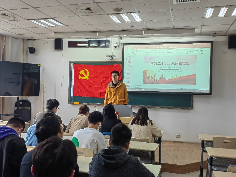 2022级党员骨干们在良乡校区教学楼210教室收看了中国共产党第二十次全国代表大会开幕会的录像,并由党支书孙立超同志为大家讲解了二十大习近平总书记报告中的重点内容。通过收看开幕会和集中学习,同学们对党的二十大主题与精神有了更为深刻的认识和了解,坚定了永远跟党走、奋进新征程的决心。