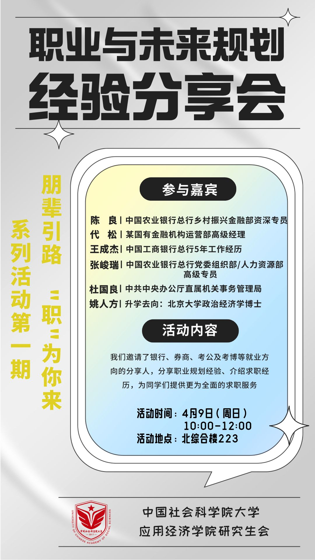 我们中国P站 研究生会,举办了“朋辈引路,职为你来”——“求职经验分享会”系列活动,在第一期活动中我们邀请了银行、券商、考公及考博等就业方向的分享人,介绍自身求职经历、分享职业规划经验,为同学们提供更为全面的求职服务。