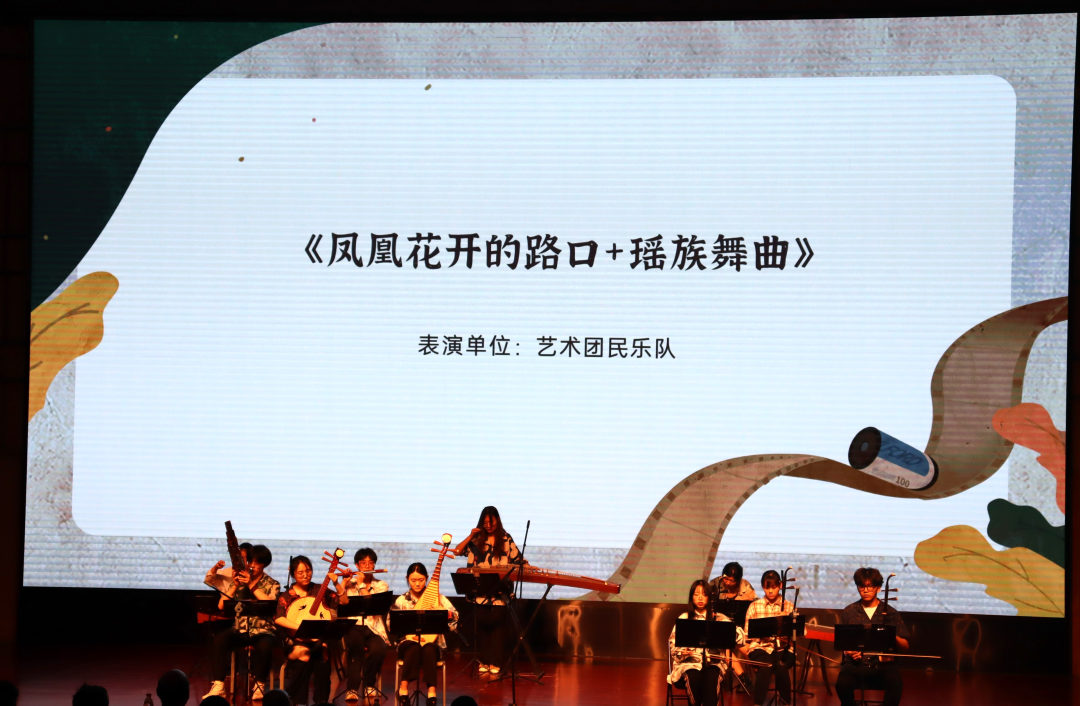 艺术团民乐队以《凤凰花的路口+瑶族舞曲》为毕业晚会拉开序幕。美妙的民乐表演如一阕古老的诗章,流淌着千年的音符将大家带入了奇妙的世界。