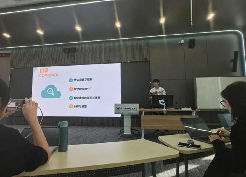 王韶章学长结合自己参加全国大学生数学建模竞赛和美国大学生数学建模竞赛的经历,向同学们介绍了参加数学建模竞赛的好处、什么是数学建模、以及队员们的分工。对于想参加数学建模竞赛的同学,学长建议大家提前一个月开始做准备。在本次分享会中,学长还特别提到了数学建模竞赛国赛和美赛的区别:一是学校会更重视国赛;二是国赛比赛时间为三天,从三道题中选择一道,美赛比赛时间为四天,从六道题中选择一道。