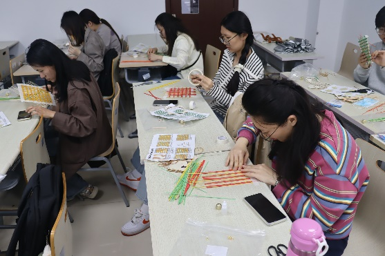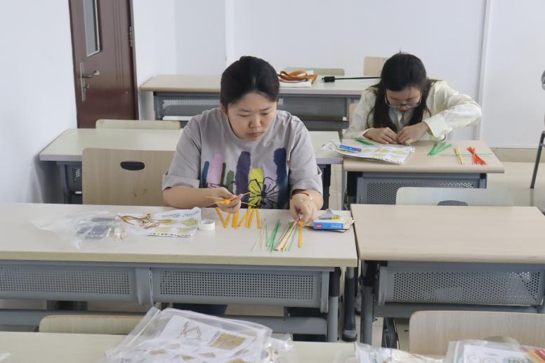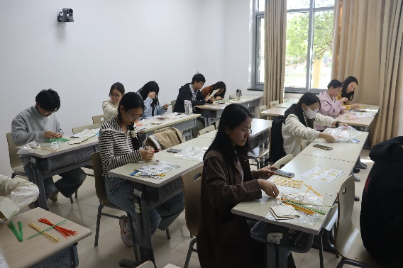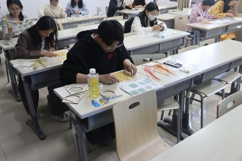 活动伊始,学院为每位参与者准备了专业竹编材料包,内含精选竹篾、彩色装饰线及全套工具,并配有详尽的制作指南。同学们从最基础的"挑一压一"编织法入手,一根根竹篾在灵巧的指尖穿梭,逐渐编织出整齐有序的纹理。活动现场洋溢着专注而愉悦的氛围,传统文化的种子在年轻的心田悄然生根。