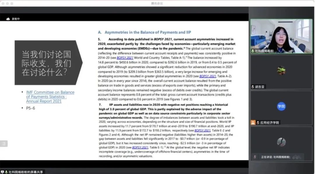 致用讲堂第九讲暨金融硕士教育中心“金融前沿与金融实务”专题讲座通过腾讯会议线上平台开讲。中国社会科学院世界经济与政治研究所国际金融研究室副主任杨盼盼老师以“国际收支理论与政策”为主题与师生们进行了深入地交流。本次讲座由金融硕士教育中心副主任胡吉亚副教授主持。